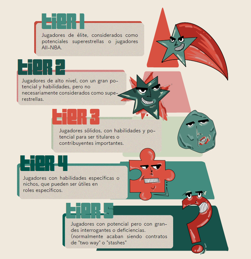 Como suele ser muy complicado clasificar del 1 al 50 a todos los prospectos especialmente cuando muchos tienen niveles de potencial similares, los tiers en un NBA Draft son una forma util de agrupar a los jugadores segun su talento, proyeccion y potencial en la liga. Estos grupos permiten a los equipos evaluarlos y compararlos de manera mas efectiva.